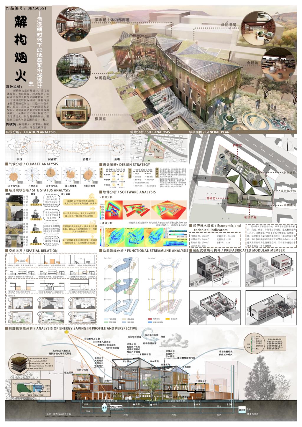 解构烟火(二等奖):基地位于河南省济源市济水大街与荆梁路交叉口附近,本项目在农贸市场原址上进行菜市场的设计与建造。设计整体分为三个部分,北侧建筑-中间菜市场主体建筑-南侧建筑,三个部分通过空中廊道串联为一个有机整体。项目采用雨水收集、太阳能板、屋顶绿化、装配式结构等多种节能减碳措施,打造了一个集休闲、娱乐、采买为一体的社区共享空间。同时,建筑通过装配式空间也增加菜市场功能的多元性和灵活性。