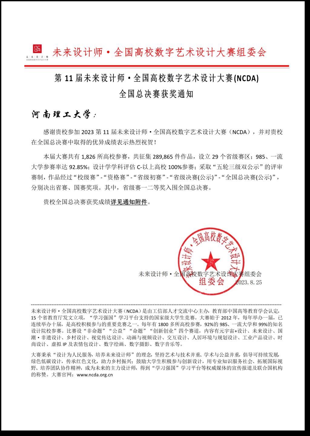 在2023第十一届未来设计师·全国高校数字艺术设计大赛中,学院环境设计专业和视觉传达设计专业学子再创佳绩,获得国赛等奖1项,省赛一等奖1项、省赛二等奖6项、省赛三等奖6项的优异成绩刘龙、袁凯老师获优秀指导教师奖