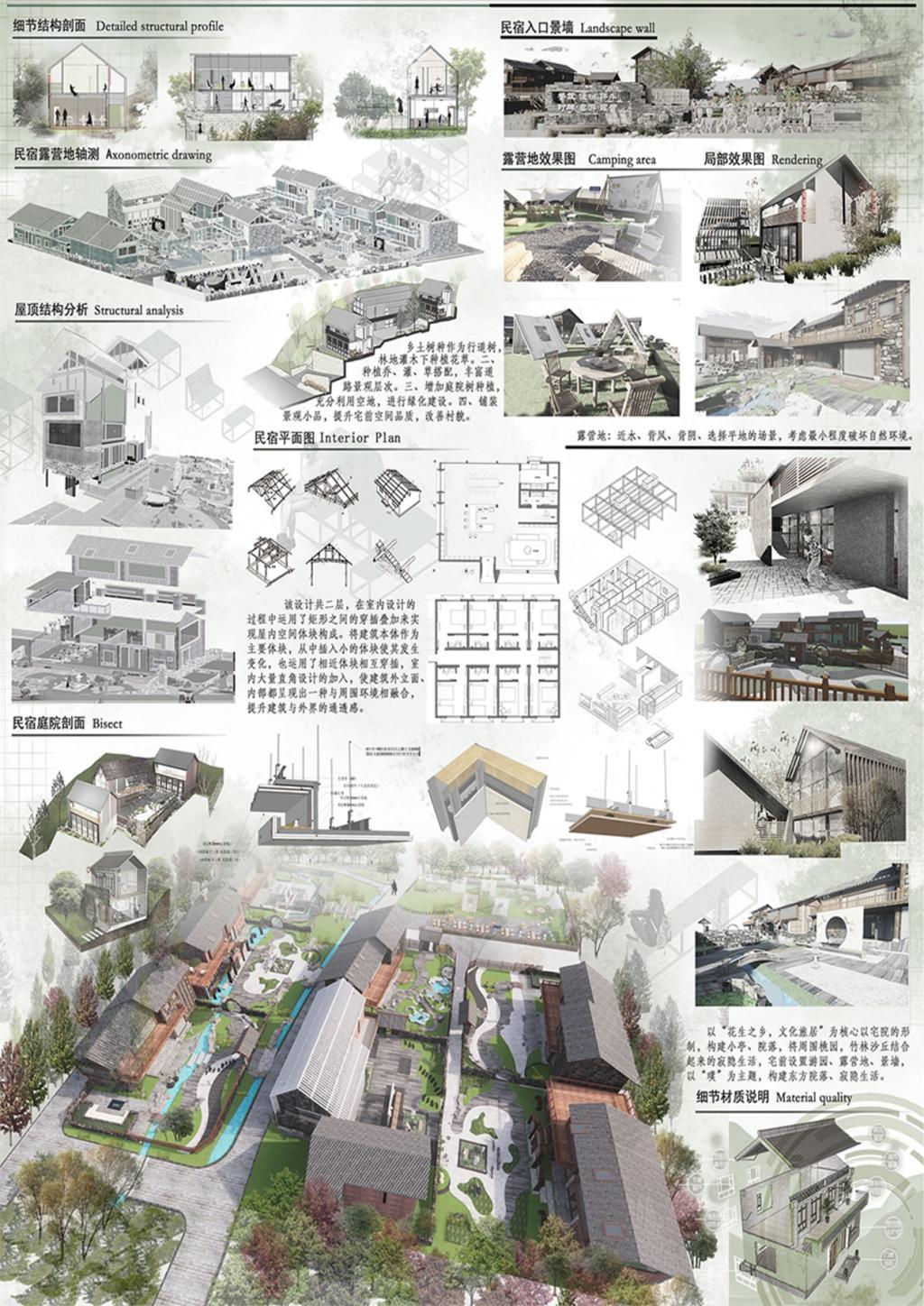 樊泽鑫等三位同学的作品“沁古叠今——集璞舍”获得国赛二等奖,该作品基于韧性视角的乡村更新设计,以武陟县中封村文旅产业发展为例,以“璞”为主题,构建东方院落、寂隐生活。以“花生之乡,文化旅居”为核心,以宅院的形制,构建小亭与院落,顺应当下的生活方式,从衣食住行的生活方式中探寻文化旅居更多的可能性,结合当地民族文化实现韵味提升,在打造新旧融合的过程中保留本土韵味。