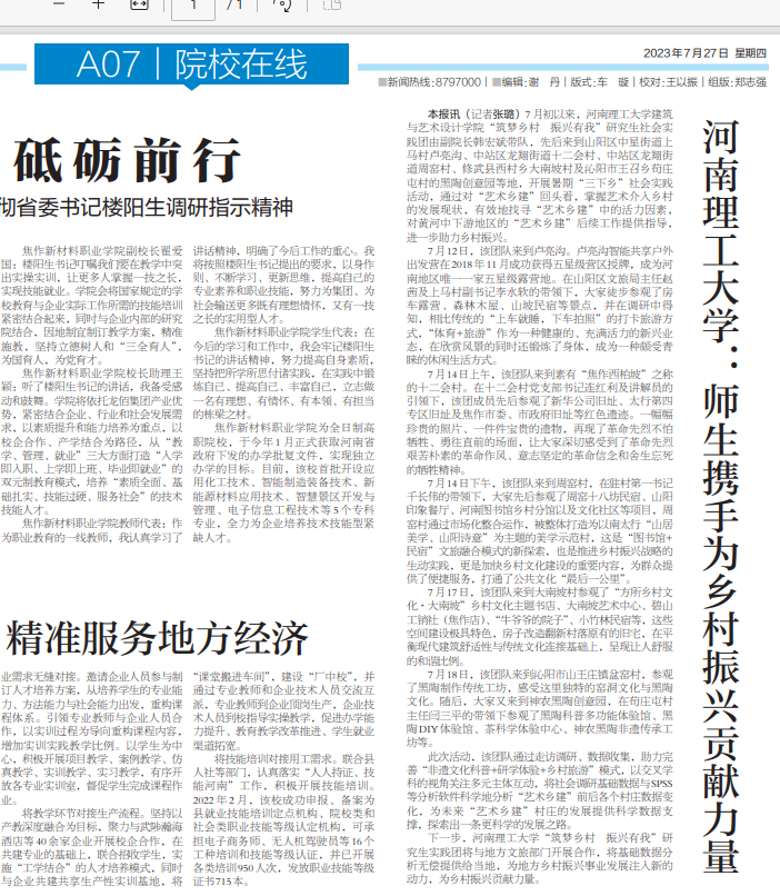 红色文旅设计,打造文旅融合“大品牌”。在素有“焦作西柏坡”之称的中站区龙翔街道十二会村,实践团成员感受红色文旅的融合发展,这里也正是该院“草帽教授”陈兴义组建的“美丽乡村行动计划”服务团队打造的红色教育典型案例。经过持续的推进发展,十二会村的红色文化已经有了一定的影响,绿色生态正在逐步实施,蓝色康养已经有了规划。研究生实践团将继续深入挖掘红色文化内涵,创新宣传教育形式,讲好红色故事,打造河南文旅融合“大品牌”,推进爱国主义和革命传统教育大众化、常态化。