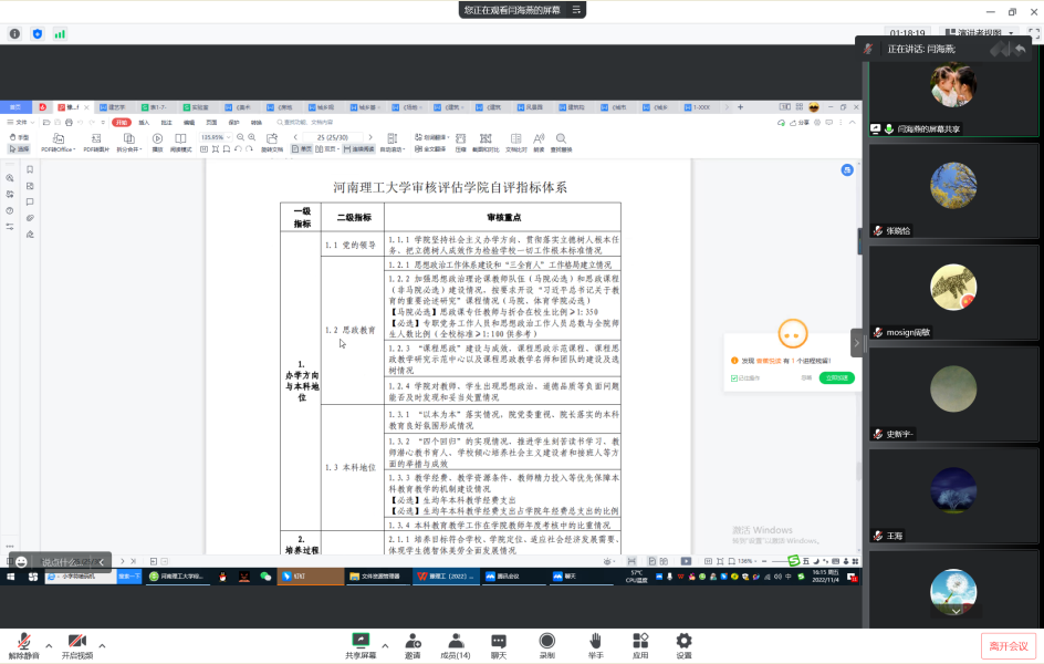 为进一步推进本科教育教学审核评估工作,11月4日下午,学院召开了审核评估工作推进会。该院审核评估工作小组全体成员、各专业负责人以及骨干教师、学院领导班子成员参加了会议,会议采用线上形式进行,副院长闫海燕主持会议。
