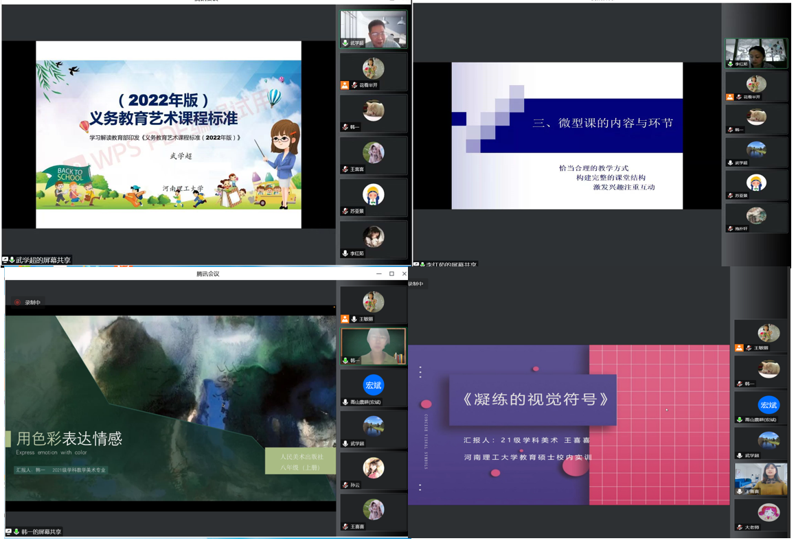 为了帮助学科教学(美术)专业学生逐步掌握中小学美术教学基本技能,提高学生参加教育技能实训的积极性。近期,学院通过线上开展了2021级学科教学(美术)专业硕士生校内实训实践活动。本次活动由韩宏斌副院长主持,教育硕士管理中心主任武学超教授、焦作市解放区教育局美术调研员李红茹、全体学科教学(美术)专业导师及硕士生参加活动。