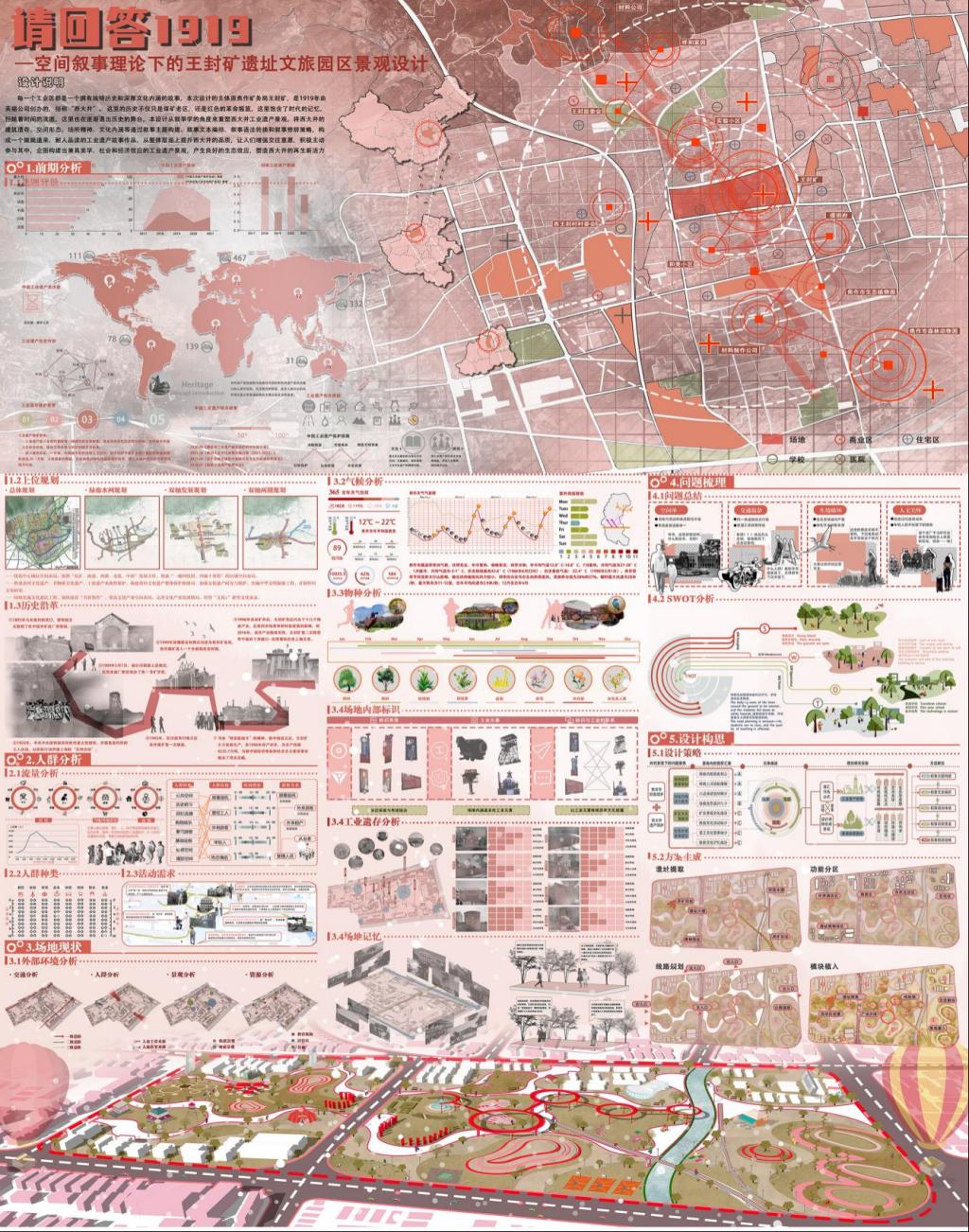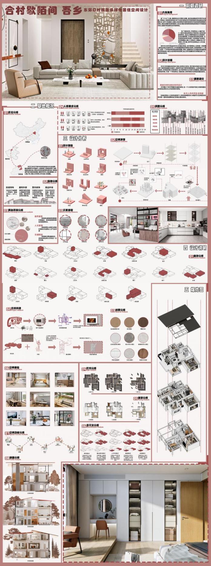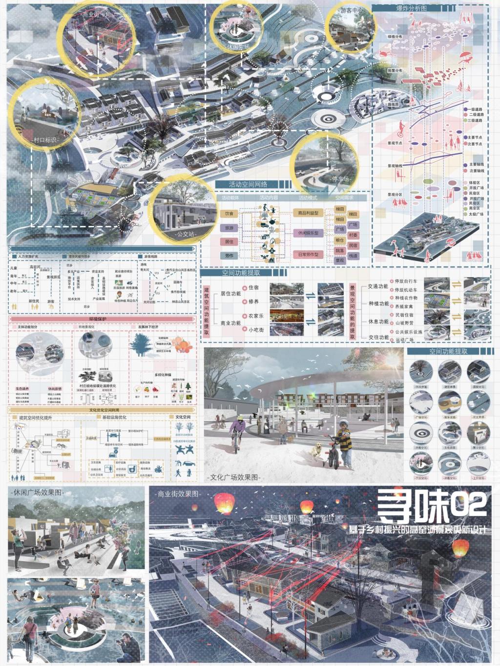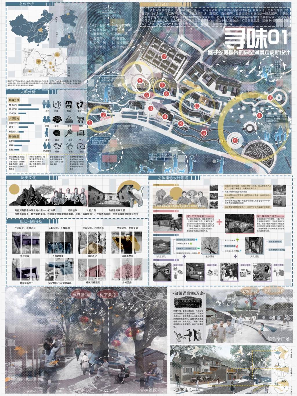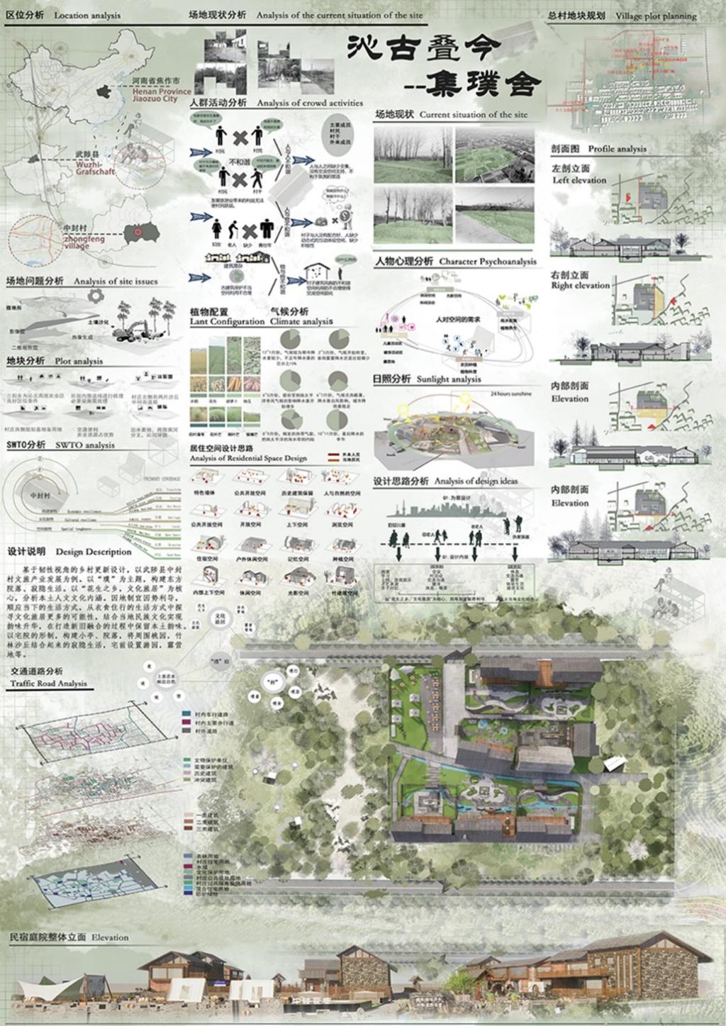 樊泽鑫等三位同学的作品“沁古叠今——集璞舍”获得国赛二等奖,该作品基于韧性视角的乡村更新设计,以武陟县中封村文旅产业发展为例,以“璞”为主题,构建东方院落、寂隐生活。以“花生之乡,文化旅居”为核心,以宅院的形制,构建小亭与院落,顺应当下的生活方式,从衣食住行的生活方式中探寻文化旅居更多的可能性,结合当地民族文化实现韵味提升,在打造新旧融合的过程中保留本土韵味。