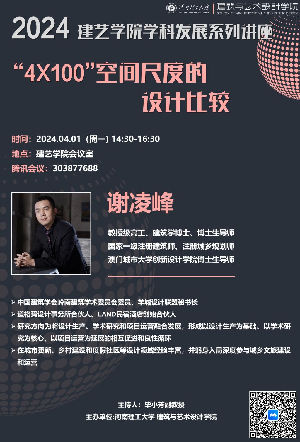 4月1日下午,道格玛设计事务所合伙人、澳门城市大学创新设计学院博士生导师谢凌峰教授通过腾讯会议在学院教工之家为学院师生开展关于“4×100”空间尺度的设计比较的讲座,讲座由学院毕小芳副教授主持。