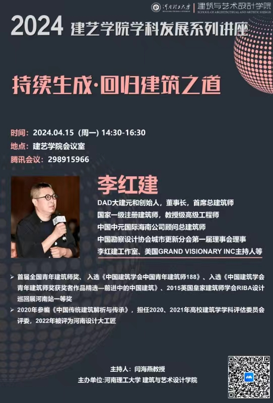 为进一步提升学院教师和学生的科研能力与专业素养,推进教育教学事业高质量发展,4月15日下午,DAD大建元和设计创始人李红建教授在学院大会议室开展了“持续生成·回归建筑之道”的学术讲座,讲座由校教师中心主办、动画疯