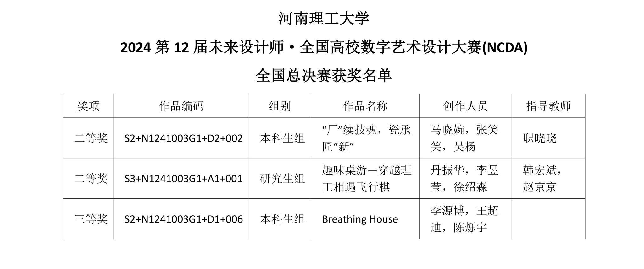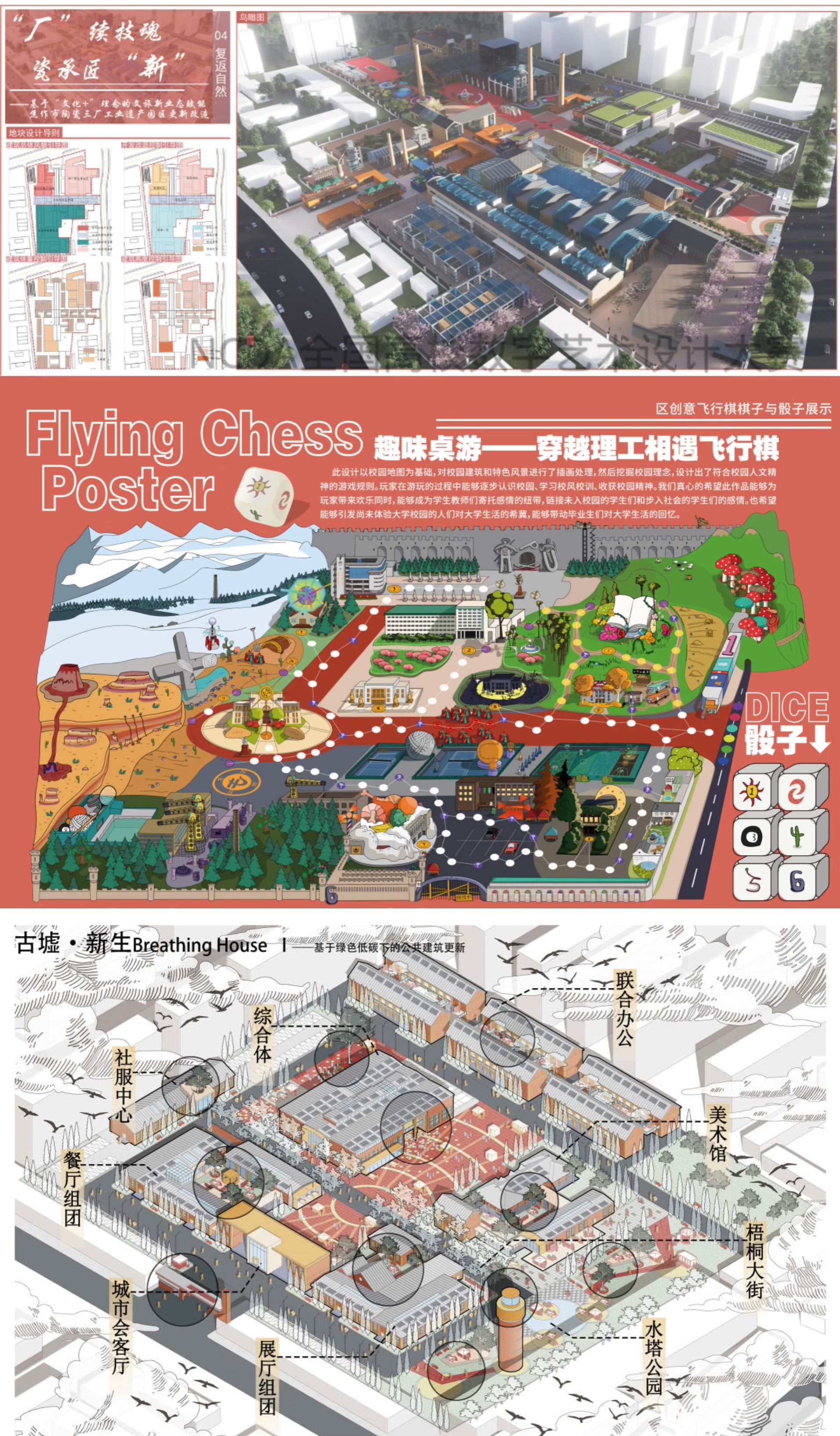 在本次大赛中,建艺学子表现突出,荣获全国总决赛二等奖2项、三等奖1项,以及河南省赛区一等奖5项、二等奖3项、三等奖6项的好成绩。韩宏斌、王璐、王维天、袁凯、赵京京和职晓晓六位老师荣获“优秀指导老师”称号。马晓婉、张笑笑、吴杨同学的《“厂”续技魂,瓷承匠“新”》荣获国赛二等奖,该项目旨在通过陶瓷三厂工业遗址的更新改造,在“文化+”理念下,充分利用其所具有的资源优势和特色文化,在保护其文化历史的同时,呈现以绞胎瓷文化为主题的旅游景区,打造绿色科技园区;丹振华、李昱莹、徐绍森同学的《趣味桌游—穿越理工相遇飞行棋》荣获国赛二等奖,该作品对校园建筑和特色风景进行插画处理,充分挖掘校园理念,设计出符合校园人文精神的游戏规则。玩家在游玩的过程中能够逐步摸清校园地图,触摸校风校训,能够在游玩的同时收获校园精神;李源博、王超迪、陈烁宇同学的《Breathing House》荣获国赛三等奖,该作品选择焦作平原光电旧厂区进行名为“古墟·新生”的工业遗产改造项目,旨在注入现代特色和活力。考虑文化和历史价值,以可持续发展为基础,采用被动处理技术改善室内环境。综合考虑城市工业发展、多元人群和功能需求,重新构思公共空间,保留原有古树和建筑,融入现代设计手法,创造多功能活动空间。