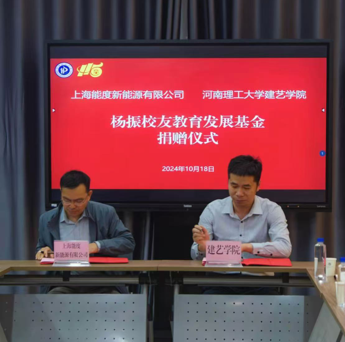 在学院会议室举办校友教育发展基金捐赠仪式。副校长边亚东、院长王同文、上海能度新能源有限公司总经理杨振、北京大洋天空软件有限公司总经理陈兵、2001级工业设计专业校友及师生代表出席了本次仪式,仪式由院党委书记张建新主持,院党委副书记张明介绍了两位优秀校友的基本情况。
