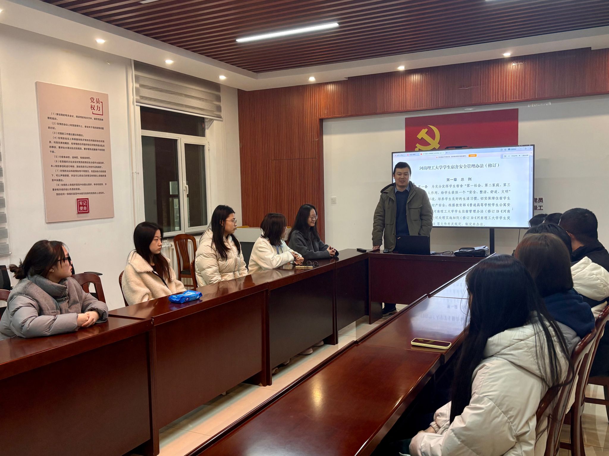 关于宿舍安全管理相关要求,加强学生宿舍安全建设共创和谐校园。班会上,各年级辅导员带领学生认真学习了《动画疯