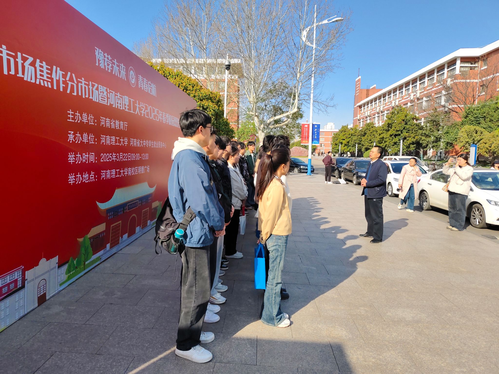 2025年春季校园双选会,学院党委书记张建新、毕业班辅导员现场进行就业指导。