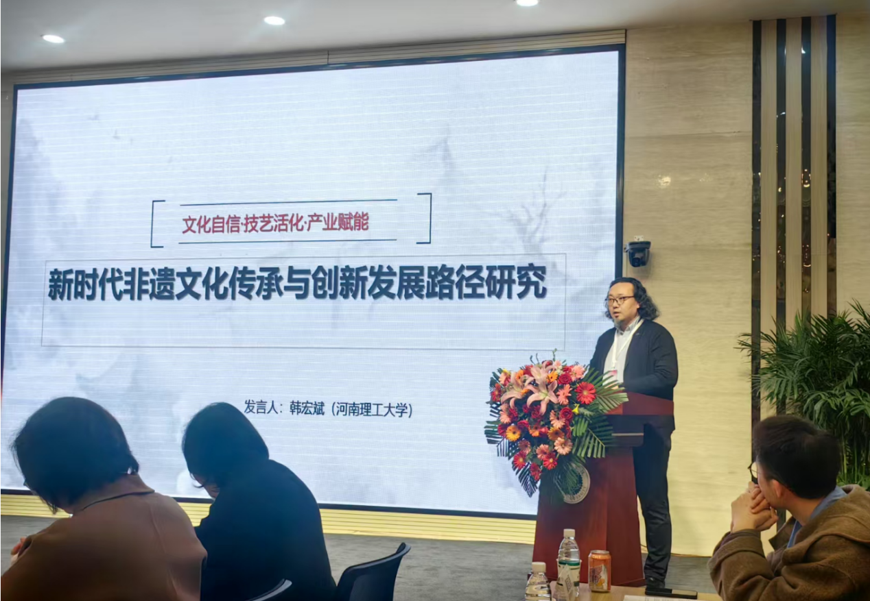 论坛研讨中,韩宏斌做《文化自信・技艺活化・产业赋能——新时代非物质文化遗产传承与创新发展路径研究》主题报告。结合多年实践经验,韩宏斌系统阐述了非遗传承的 “四位一体” 发展范式:以文化基因解码为根基,深入挖掘非遗的精神内核与符号价值,强化文化身份认同;构建“导师制+学院制”双轨培养机制,既保留传统技艺的本真性传承,又融入现代设计教育体系,培养兼具文化底蕴与创新能力的复合型人才;通过产业赋能激活非遗的经济价值与社会功能,推动非遗从“活态保护”向“活态发展”转型;呼吁构建政府、高校、企业、传承人多元协同的合作网络,在坚守文化内核的前提下,实现保护与创新的动态平衡。韩宏斌指出,AI技术为非遗的数字化采集、传播与产品创新提供了新工具,但技术应用需始终服务于文化表达,避免过度商业化对非遗本真性的消解。