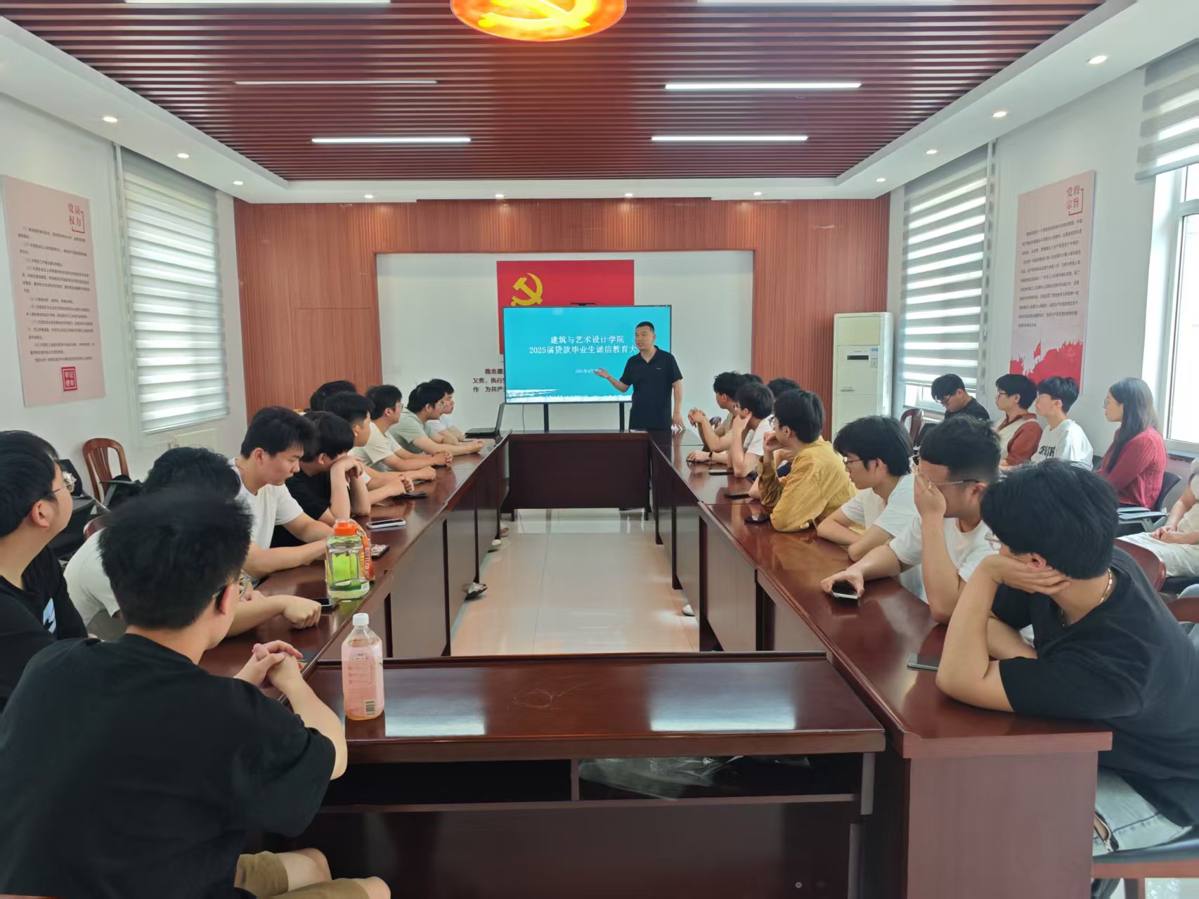 为进一步强化学院贷款学生的诚信意识与社会责任感,帮助2025届毕业生全面了解掌握还款要求及流程,保障学院高校贷款工作有序开展,4月27日,学院在党建活动室开展了 2025届贷款毕业生诚信教育大会。大会由学院学工办副主任金欢主持,近40名贷款毕业生参加了大会。