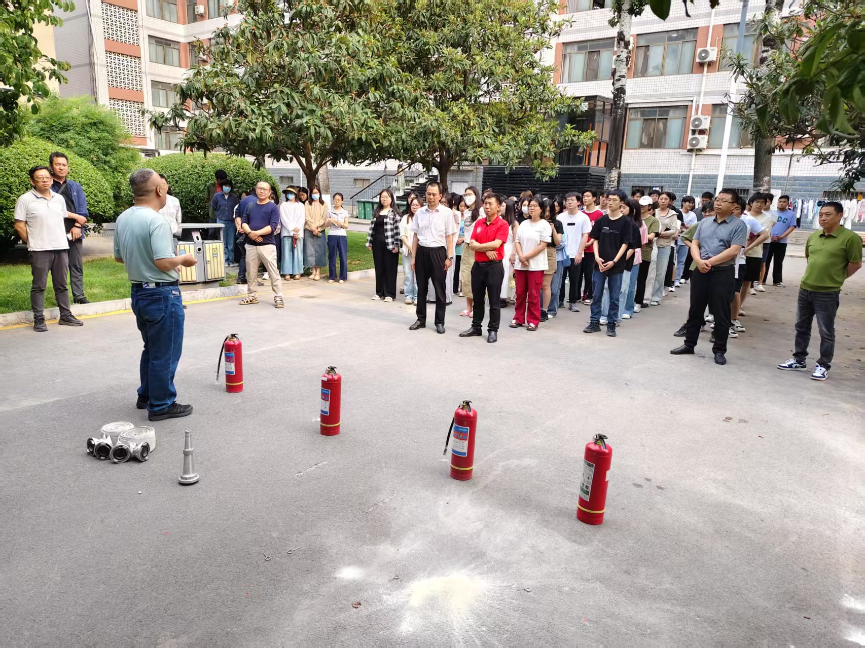 师生在学院楼前举行消防安全培训和应急疏散演练活动。