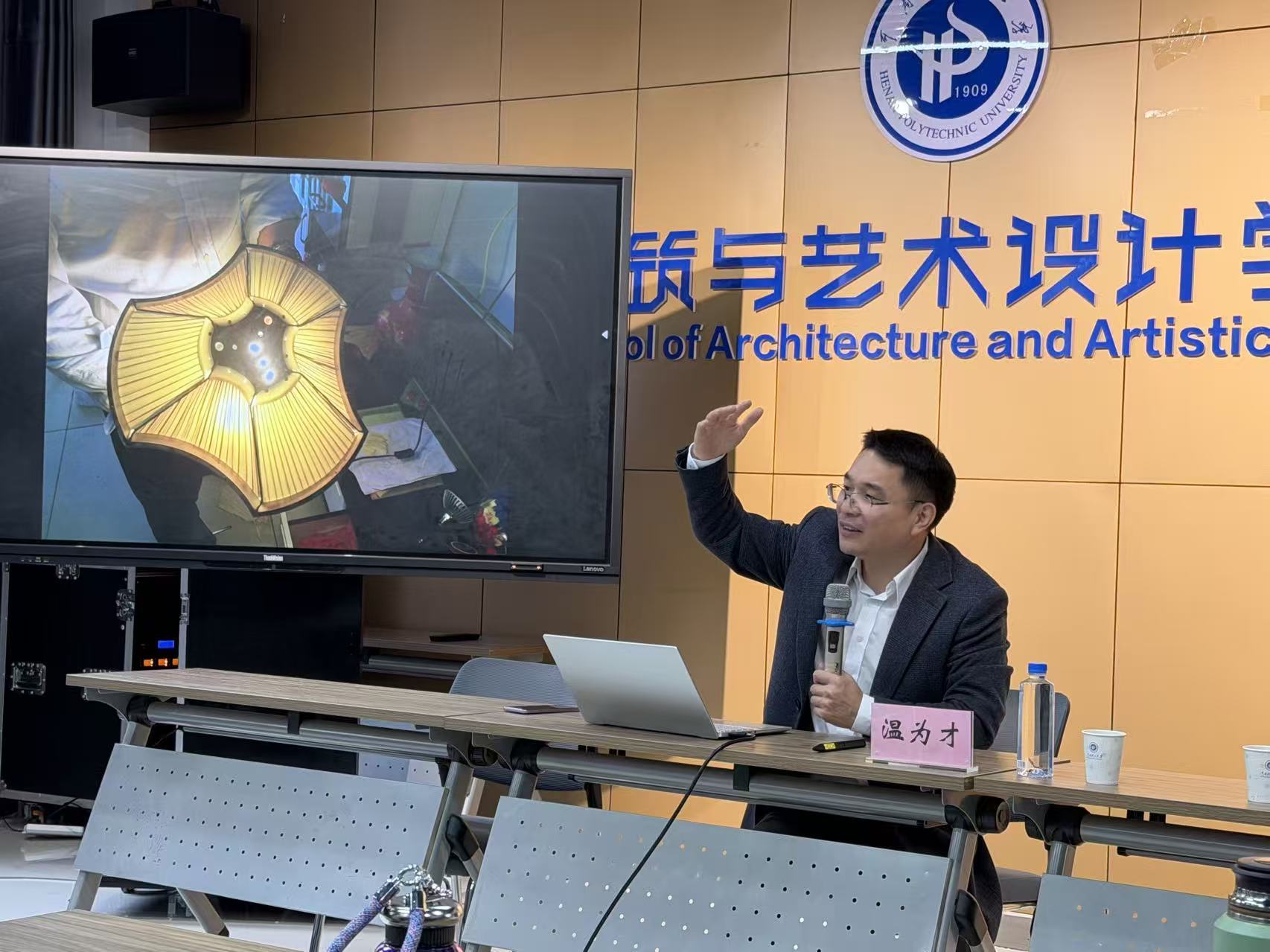 交流中,温为才提出设计学硕士论文的五大维度,并结合自身指导硕/博士论文的经验进行分享。他指出当前部分设计学硕士的论文存在缺乏新观点,新角度的问题,强调选题需结合时代新的特点,只有聚焦社会新时代的真实需求,论文才能兼具学术深度与应用价值。在互动提问环节,现场师生积极发言提出相关问题与温为才深入交流。相关教师们则就课程教学如何引导学生关注产业选题与温为才进行探讨。