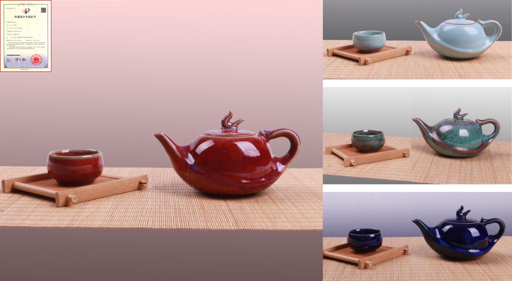 文化为主题而设计的钧瓷茶具。壶身形态要素来自动画疯